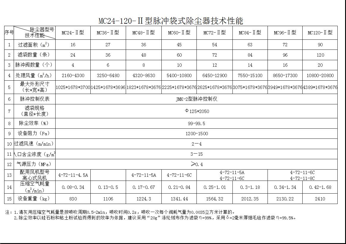 MC-Ⅱ型脈沖袋式除塵器有灰斗,進(jìn)氣口,上箱體、下箱體(內(nèi)置除塵過(guò)濾布袋)、出氣口、引風(fēng)機(jī)、電磁閥及配套氣泵組成。工作時(shí),含塵氣體由進(jìn)氣口進(jìn)入灰斗,粗粒塵直接落入灰斗底部,細(xì)粒塵隨氣流向上進(jìn)入上箱體,粉塵積附在濾袋外表面,凈氣通過(guò)各濾袋口匯集到上箱體內(nèi)至出氣口經(jīng)引風(fēng)機(jī)排出。隨過(guò)濾過(guò)程的不斷進(jìn)行,濾袋外表層積塵逐漸增多,從而使收塵器阻力增高,當(dāng)阻力升至一定范圍(1200~1500Pa),清灰控制系統(tǒng)發(fā)出信號(hào),通過(guò)自動(dòng)脈沖控制儀打開(kāi)脈沖閥,壓縮空氣經(jīng)噴管向每條濾袋噴射氣流,使濾袋產(chǎn)生變形,震動(dòng),積附在濾袋外表面的粉塵被吹落至灰斗內(nèi),達(dá)到清灰的目的。