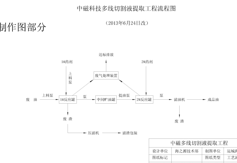 多線切割廢液先進(jìn)行離心分離,將大多數(shù)的較大碳化硅及磁鐵顆粒分離出來,分離后廢渣進(jìn)入1#廢渣貯罐,廢液進(jìn)入1#反應(yīng)器內(nèi)加入1#、2#藥劑進(jìn)行化學(xué)反應(yīng),廢液中的小粒徑顆粒被分層分離,廢渣通過1#反應(yīng)罐下部的閥門排入廢渣貯罐,而多線切割液排入中間貯油罐進(jìn)行再分離,分離后油在2#反應(yīng)罐內(nèi)加入3#藥劑,在加熱的情況下進(jìn)行進(jìn)一步精制,精制后的油經(jīng)過濾油機(jī)過濾處理,流入成品油罐,濾餅外運(yùn)處理。